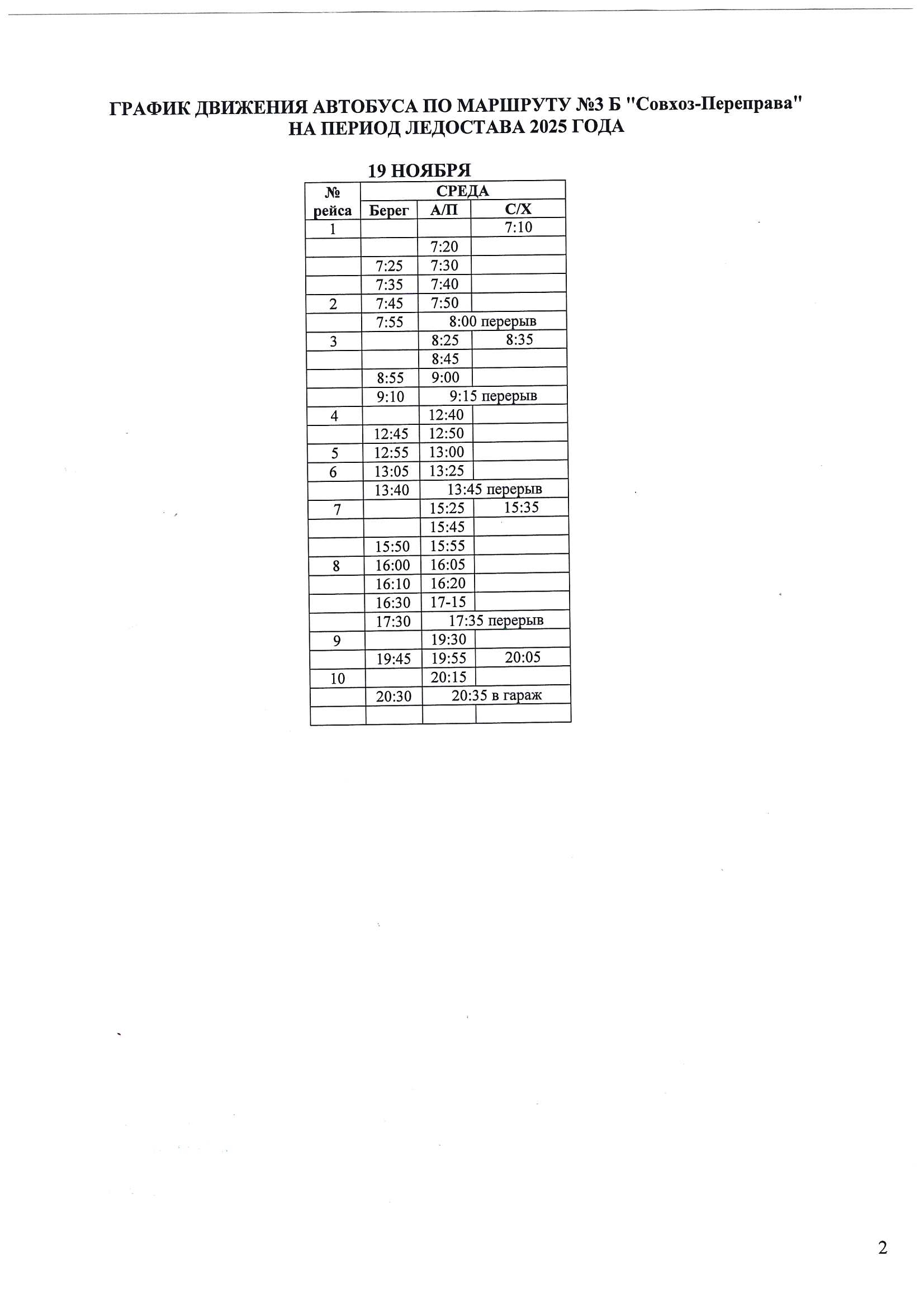 Расписание автобуса №2 к СВП осень 2025г.