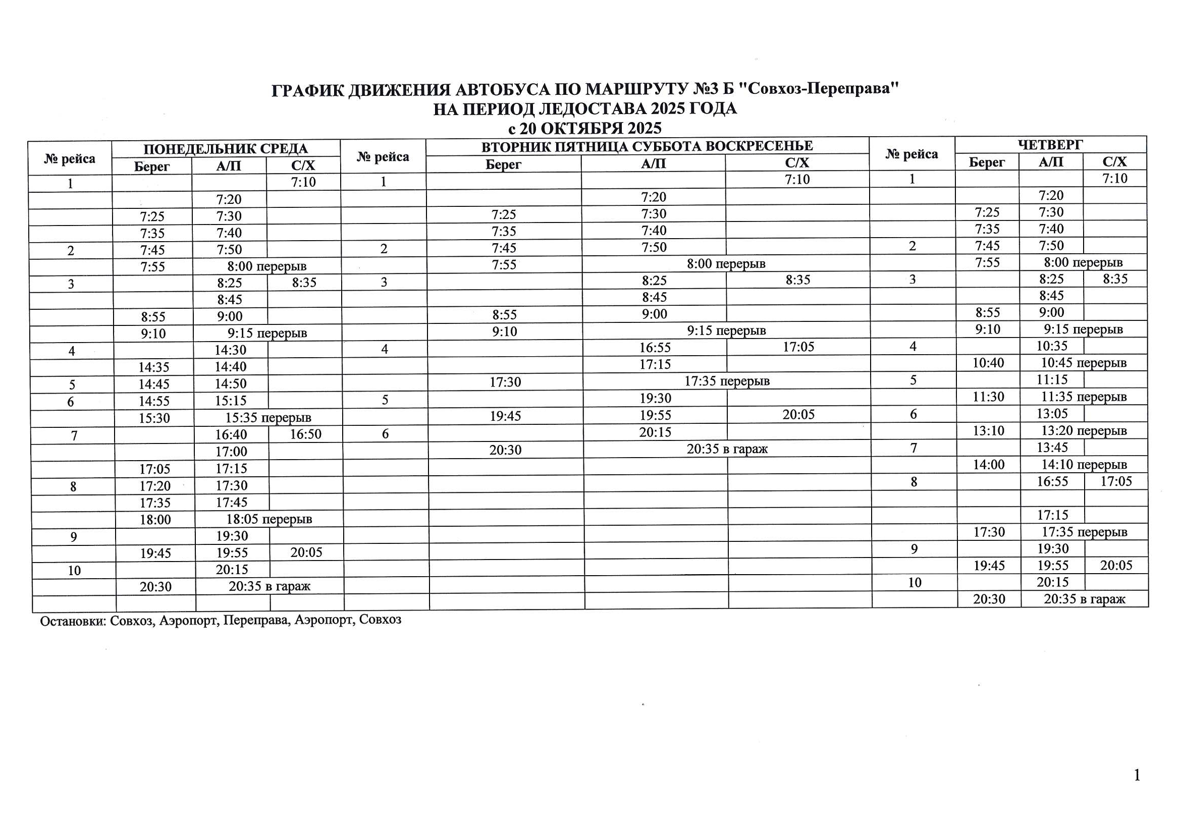 Расписание автобуса №1 к СВП осень 2025г.