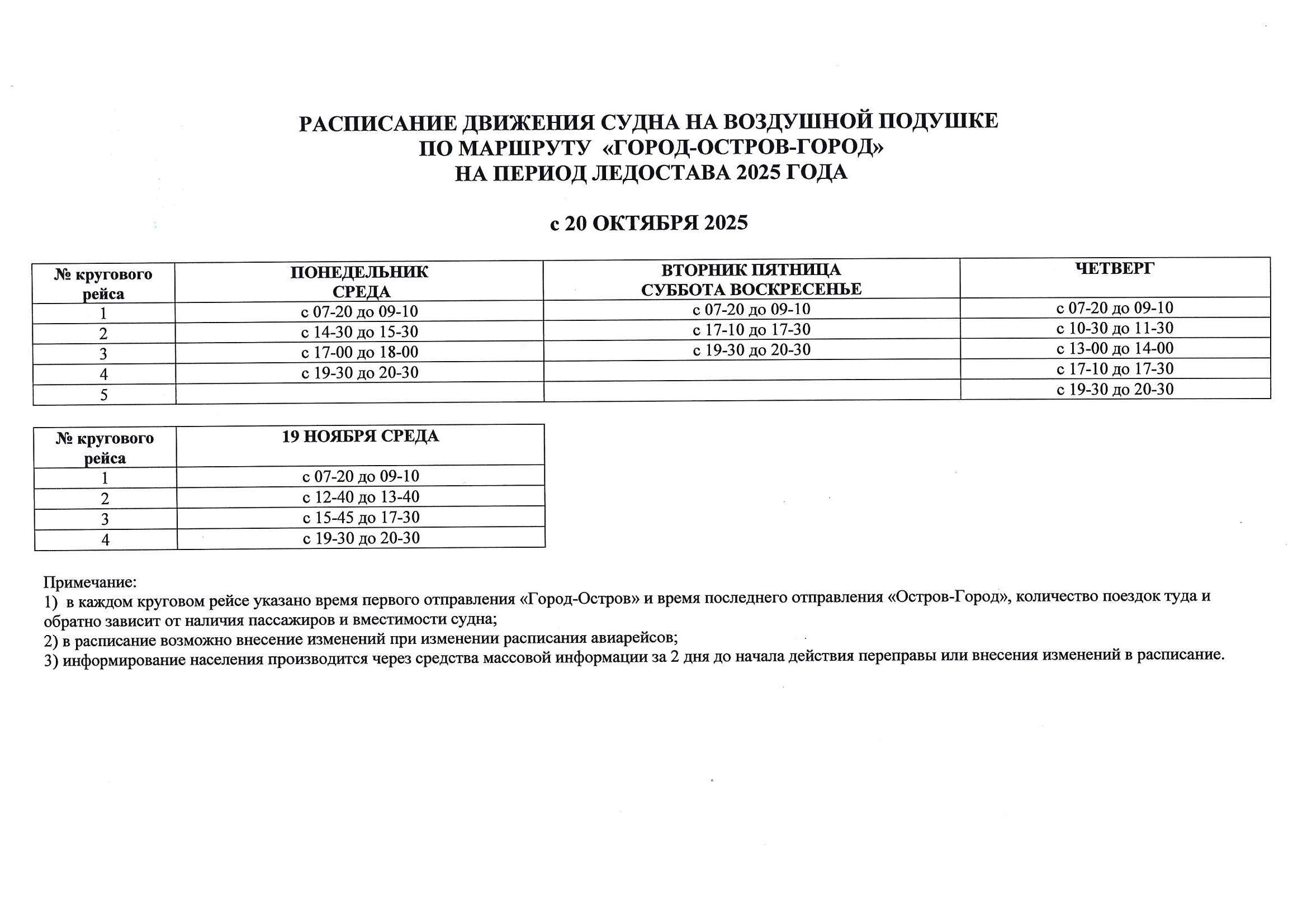 Расписание судна на воздушной подушке СВП осень 2025г.